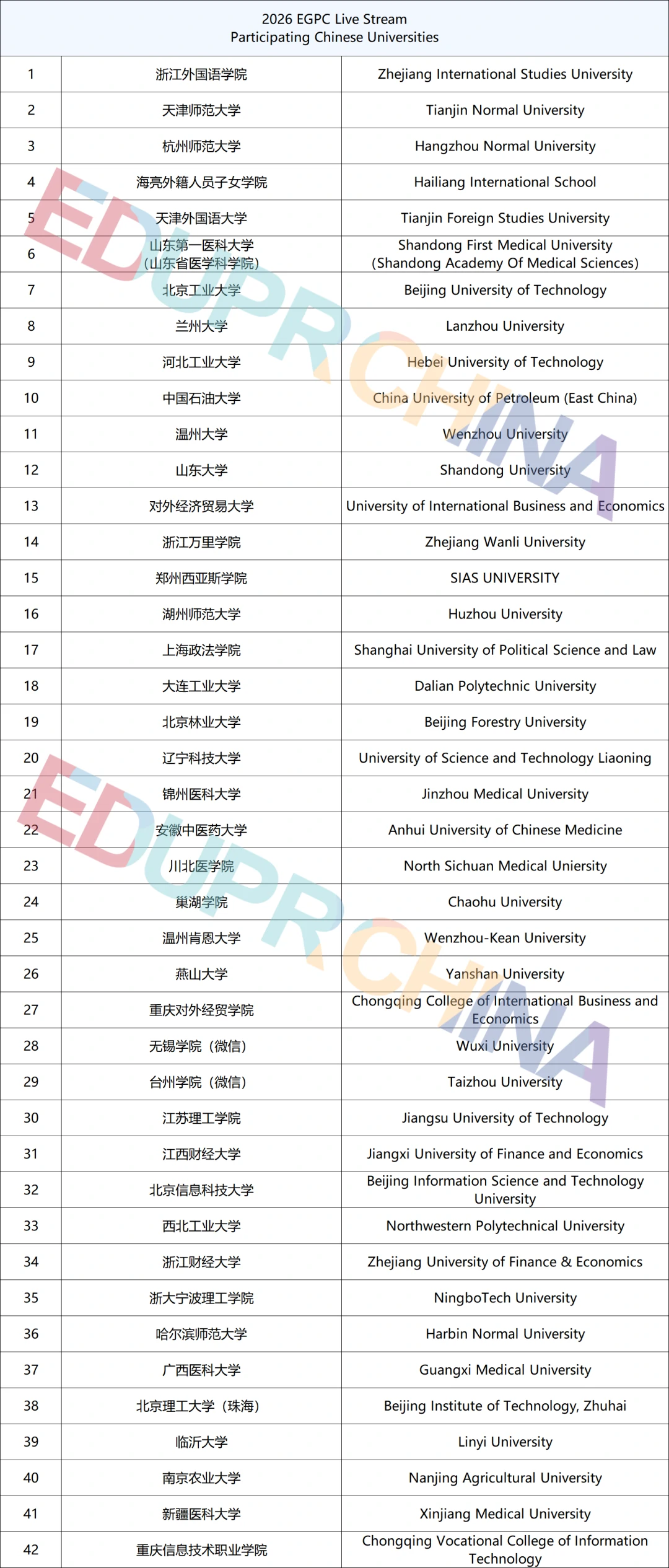 A total of 42 Chinese universities will join the EGPC live stream, of which about 18 universities will enter the EDUPRCHINA live stream. The list is random.