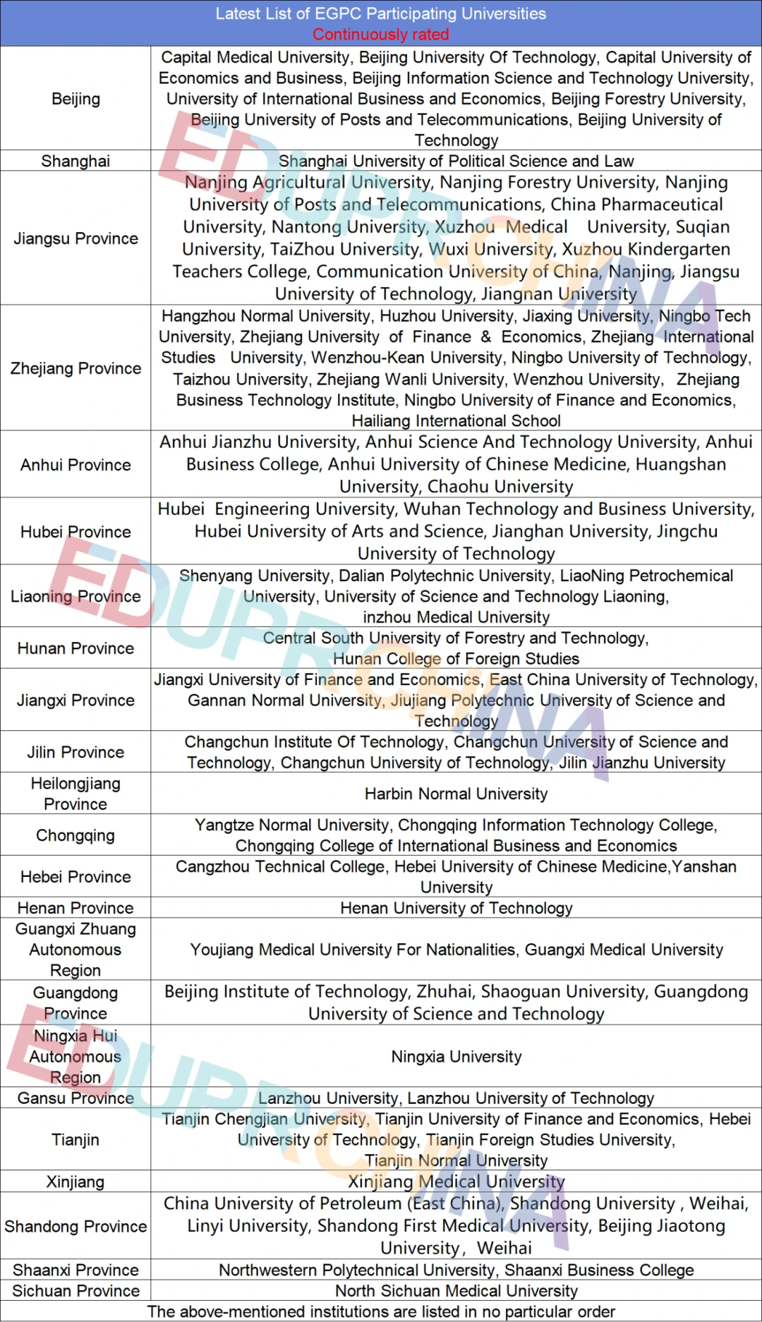 For participating Universities, this list below is the newest participating universities